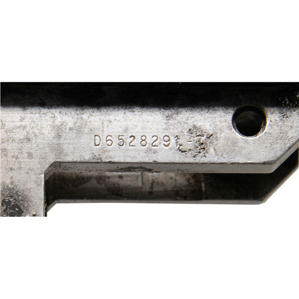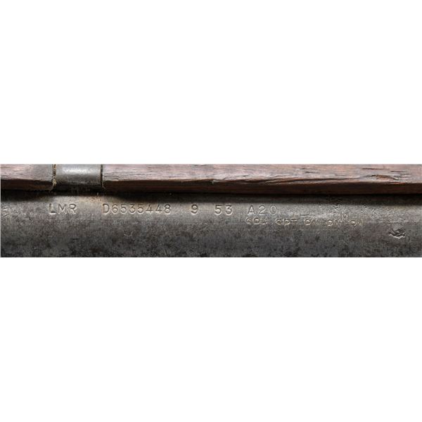 GARAND BARRELED RECEIVER. Cal. 30-06. S# 5068661. Bbl. 24". Receiver has standard International Harvester markings at heel & drawing number "D6528291". Receiver is fitted w/ T105E1 aperture rear sight. Clip latch assembly is installed. Barrel has both walnut handguards w/ the associated hardware. Gas cyl. assembly is complete w/ front sight, high hump gas cyl. lock, lock screw & stacking swivel. Throat gauges: 3.0. Muzzle gauges: 7.0. CONDITION: handguards have extensive wear, staining & handling marks, but no visible cracks. Metal has extensive wear, turning overall gray & patina w/ areas of oxidation. Notable pitting at bottom of receiver rails. Bore has worn lands turning dark in grooves. (25-3143/RW). MODERN. $300-500.