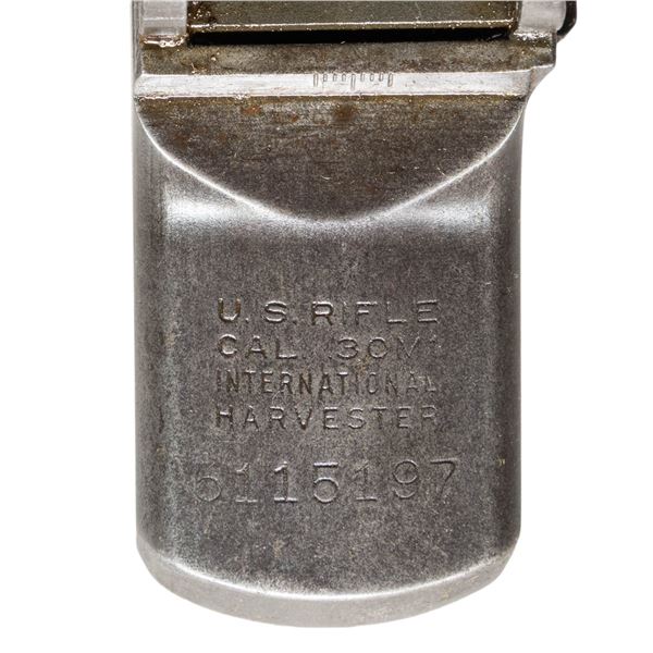 GARAND RECEIVER. S# 5115197. Receiver marked at heel "U.S. RIFLE / CAL. .30M1 / INTERNATIONAL / HARVESTER / serial number". Marked on right forward end "D6528291-X". No parts are present. CONDITION: well-worn receiver turning gray and patina w/ very light spots of fine pitting on front face of receiver ring. (25-2895/RW). MODERN. $250-450.