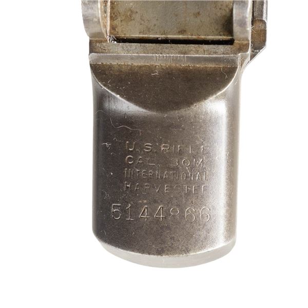 GARAND RECEIVER. S# 5144866. Receiver marked at heel "U.S. RIFLE / CAL. .30M1 / INTERNATIONAL / HARVESTER / serial number". Marked on right forward end "D6528291-X". No parts are present. CONDITION: well-worn receiver has areas of deep pitting on receiver ring face & below wood line. (25-2890/RW). MODERN. $250-450.