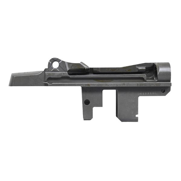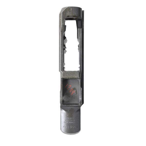 GARAND RIFLE RECEIVER. S# 4669564. Receiver manufactured by Harrington & Richardson Arms and carries the standard markings at the heel. Drawing number at right forward end is "D-6528291". Right front receiver leg is faintly electro-penciled "BA4 / 6-66" indicating an overhaul at the Benicia Arsenal in 1966. Receiver contains no additional parts. CONDITION: receiver is in very good condition retaining nearly all its arsenal rework Parkerized finish. Rear sight notches appear in very good condition. (25-3079/RW). MODERN. $400-600.