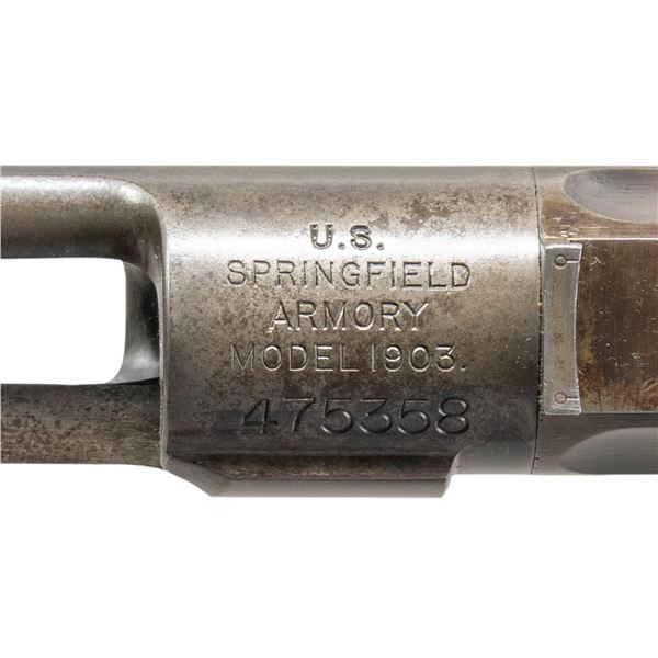 Cal. 30-06. S# 475358. Bbl. 24". 1911 production barreled receiver w/ original finish. Barrel is marked behind front sight "SA / flaming bomb / 4-11". Receiver carries no additional parts. Barrel has front & rear sight bases correctly installed. CONDITION: receiver has thinning original blue turning gray w/ a mottled appearance. Barrel retains 60% original blue w/ thinning, light wear & beginnings of patina. Bore w/ worn lands, has frosted grooves. (25-2927/RW). MODERN. $200-400.