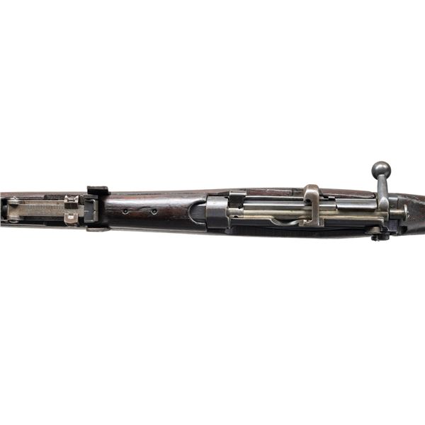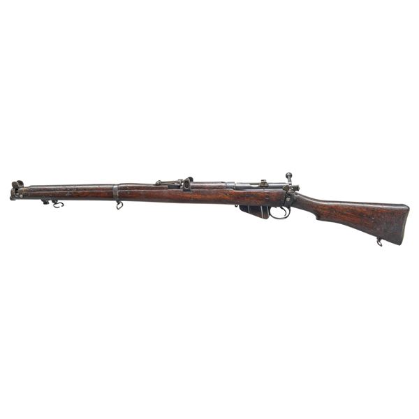 Cal. 303 Brit. S# S4997. Bbl. 25 1/5” dated 1916 & marked with British sale proofs under rear of handguard. Standard SMLE MKIII sights. No legible forend number present but other parts are matching to receiver with rear sight being arsenal force matched. Early SSA “Peddle Scheme” rifle. Right side of socket marked “(Crown)/GR/1916/SHTLE/III*”. Rear left of socket marked “SSA” for Standard Small Arms. Arsenal rework blued finish. Hardwood stock set with bottom mounted sling swivels. Handguard has a portion removed around rear sight base on both sides. Stock disc has markings that appear to be Farsi or Arabic. MAGS: 10 rd mag. CONDITION: stock set has arsenal rework appearance with added oil finish, some gouges, scattered dings, handling marks & scratches. Socket displays a loose metal fit. Metal otherwise retains 30% arsenal blue with overall fading, some pitting on socket, scattered oxidation, edge & handling wear. Action functions properly when hand cycled. Fair bore with scattered frosting & light pitting but good rifling. (25-2840/MJC). CURIO. $300-500.