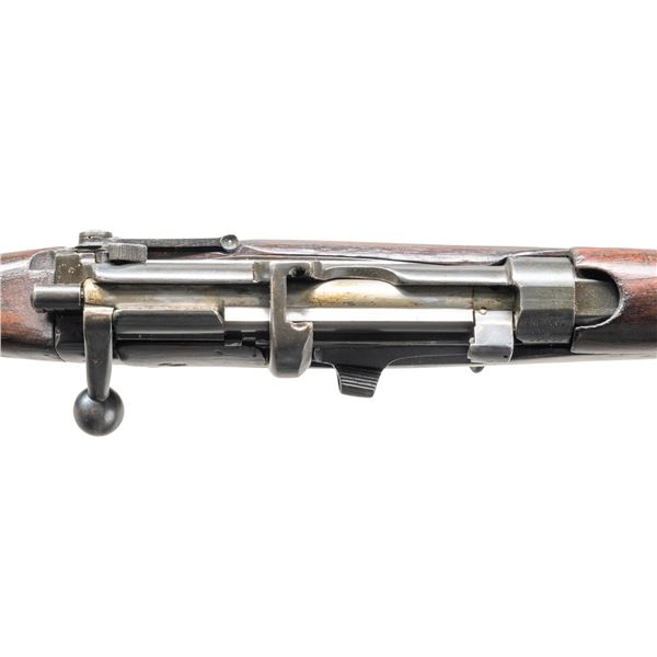Cal. 303 Brit. S# N67193. Bbl. 25 1/5". Blade front sight with protective ears. Tangent rear sight graduated to 2000m. Front & rear volley sights present. All matching numbers with bolt & rear sight being arsenal force matched. Bbl. is marked with British sale proofs under rear handguard. Receiver has "ENGLAND" import marking. Right side of socket has LSA, crown, SHTLE III & 1916 markings. Mag cutoff present. Blued finish. Hardwood stock set with blank brass disc. Bottom mounted sling swivels with leather sling. MAGS: 1-10 rd. unnumbered detachable. CONDITION: stock set has arsenal rework appearance with added oil, a couple small putty repairs on front of handguard, a few armorer patch repairs, a carved "T" symbol ahead of buttplate, a few gouges, scattered dings & handling marks. Metal retains 30-40% arsenal rework blue with some finish overrun, overall fading to gray, some handling marks & light oxidation. Safety is functional but sometimes goes upward a bit & action is otherwise functional when cycled. Bore shows some frosting & light pitting but strong rifling. (25-3096/MJC). CURIO. $500-800.