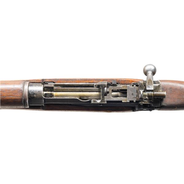 Cal. 303 Brit. S# PF309642. Bbl. 25 1/5" with Century import marking. Standard No. 4 MK2 sights Matching numbers on receiver & bolt handle. Forend & mag match each other but not receiver. Left side of receiver has No 4Mk2 (F) markings with 5/54 date. Suncorite finish. Beech stock set with bottom mounted sling swivels. Handguard & butt have a darker appearance than forend. MAGS: 1-10 rd. detachable. UNATTACHED ACCESSORIES: No. 9 MKI bayonet that is matching to receiver with matching scabbard. CONDITION: stock set shows scattered dings, gouges, handling marks, worn finish & staining. Metal retains 50% Suncorite with overall flaking, scattered fading to gray & some oxidation. Action functions properly when hand cycled. Bore has worn rifling with scattered frosting & dried cosmoline. (25-2810/MJC). CURIO. $300-500.