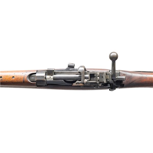 Cal. 22 LR. S# N28710. Bbl. 25 1/5". Blade front sight with protective ears. Harold Cooey (Canadian made) ladder rear sight with broad arrow "C" marking. Matching numbers on receiver, nosecap & bolt handle. Other visible parts appear unnumbered. Right side of receiver has unusual "MADE IN USA" marking possibly an import marking. Right side of socket has LSA Co. markings with 1916 date & "SHT22/IV*" markings. Mag cutoff present. Arsenal blue finish. Hardwood stock set with bottom mounted sling swivels & black leather sling. Top of butt has "325" rack number. MAGS: 1-10 rd. hollowed out for single shot 22 usage. CONDITION: stock set appears cleaned or sanded with a couple thin armorer repaired cracks on handguard ahead of rear sight, some handling marks & dings. Metal retains 40% arsenal rework blue with overall fading to gray, scattered moderate oxidation, edge & handling wear. Action functions properly when hand cycled. Bright near excellent bore. (25-2760/MJC). CURIO. $300-500.