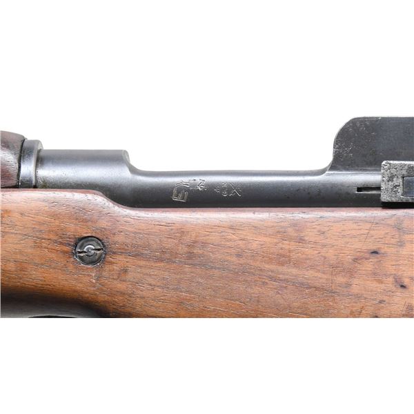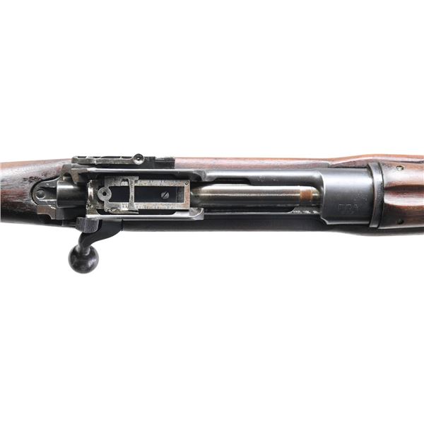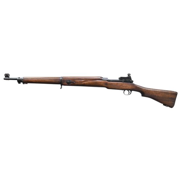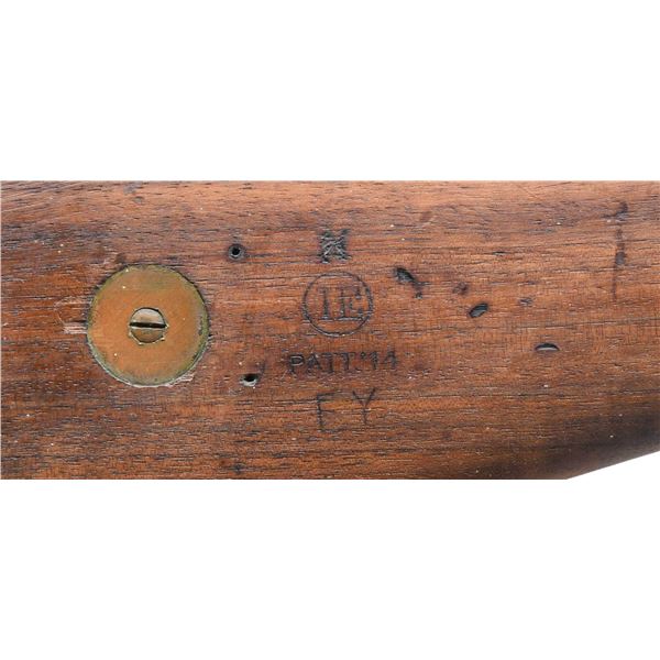 MILITARY RIFLE. Cal. 303 British. S# 573. Bbl. 26". Ladder rear sight graduated to 1,650 yards. Blade front sight w/ protective ears. Bolt is marked underneath w/ "E 6921". All visible parts markings are "E". Matching serial number on rear sight ladder. Volley sight is present & functional. Receiver has the early "ERA" marking indicating Eddystone Remington Arms. Left receiver rail has acceptance & view marks plus partial "EY" which also appears on the buttstock & means the rifle is approved for emergency use only. Walnut stock set. Stock has faint view mark under pistol grip & is marked on the right side of the stock w/ a broad arrow over an encircled "IE" indicating Eddystone manufacture. Also marked "PATT.' 14 / EY". Brass stock disc is unmarked. CONDITION: stock set has very good lightly cleaned appearance w/ generally legible markings. Stock has light wear & small scattered handling marks. Two small cracks behind receiver tang & one small missing chip at right rear of buttstock. Metal retains 75% of its original thinning blue w/ scattered spots of light oxidation & missing finish. Bore has frosted appearance w/ dark grooves leaving strong rifling. (25-2785/RW). CURIO. $400-600.