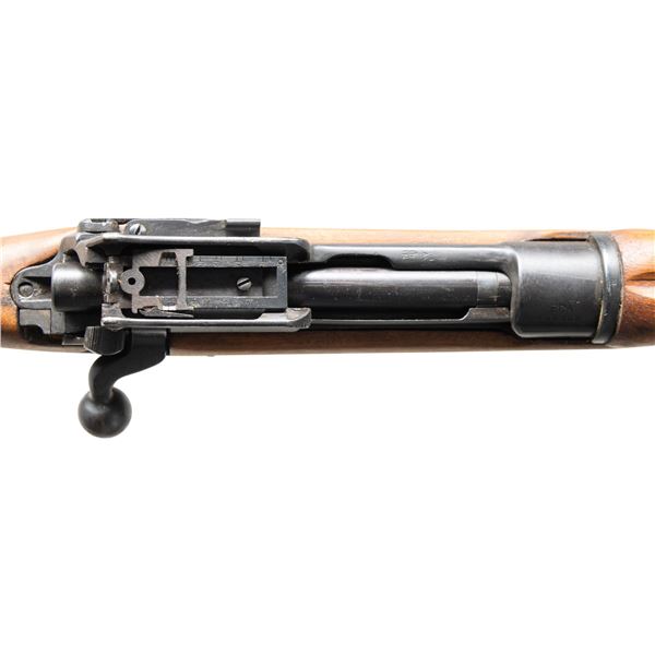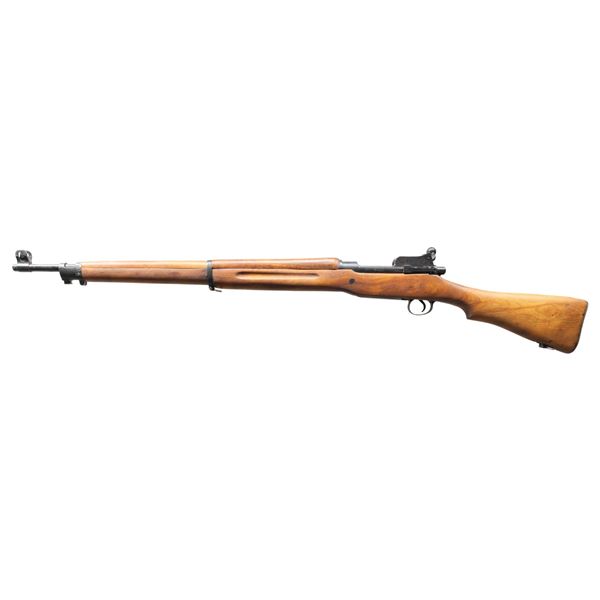 Cal. 303 British. S# 194306. Bbl. 26". Rifle has been assembled by the adapting of the Model 1917 stock. Ladder aperture rear sight graduated to 1,600 yards. Blade front sight marked "W" w/ protective ears. Receiver is marked on right side of ring "ERA". Bolt shroud, safety, bolt stop, rear sight ladder, spring & upper band marked "E". Bolt has been re-serial numbered to match receiver. Sight ladder also carries matching number. Replacement hardwood stock set. Stock is for a US 1917 rifle & has the correct grasping groove placement & does not have the provision for the volley sight. Over-stamped manufacturer's mark at stock tip is not legible. Mag. follower appears to be for the 30-06 cartridge. Stacking swivel & screw are not present. CONDITION: stock has arsenal rework type finish w/ light wear & scattered handling marks. Metal has arsenal rework black parkerization w/ thinning & light wear. Bore is shiny w/ strong lands. (25-2869/RW). CURIO. $400-600.