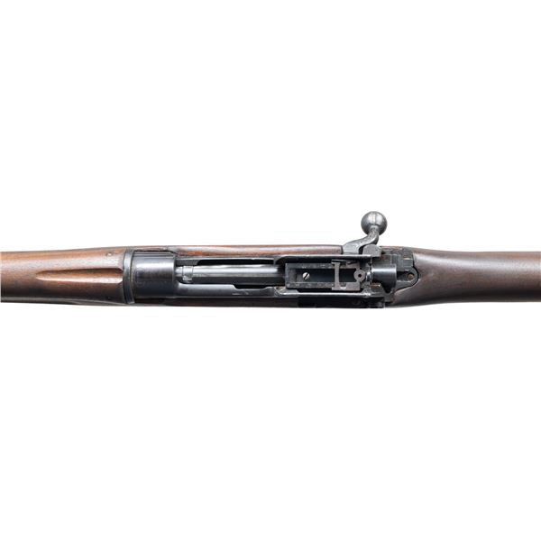 Cal. 303 Brit. S# 145904. Bbl. 26" with Century import marking. Standard P14 sights. Bolt has been arsenal renumbered to match the receiver. Other parts appear mismatched or unnumbered. Receiver top has circled "RE" Remington marking. Parts are a mix of P14 & US 1917. Metal has a mix of arsenal rework finishes. US 1917 Walnut stock set with grasping grooves, bottom mounted sling swivels & lighter colored handguard. CONDITION: arsenal refinished stock set shows a couple light chips, some dings & handling marks. Metal retains 80% mix of arsenal parkerized & Suncorite finishes with areas fading to gray, some dings, edge wear & handling marks. Action functions properly when hand cycled. Good bright bore with some light frosting. (25-3832/MJC). CURIO. $400-600.