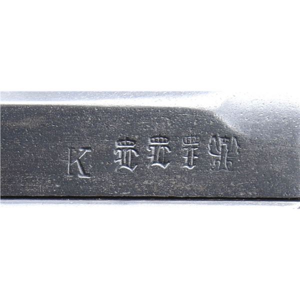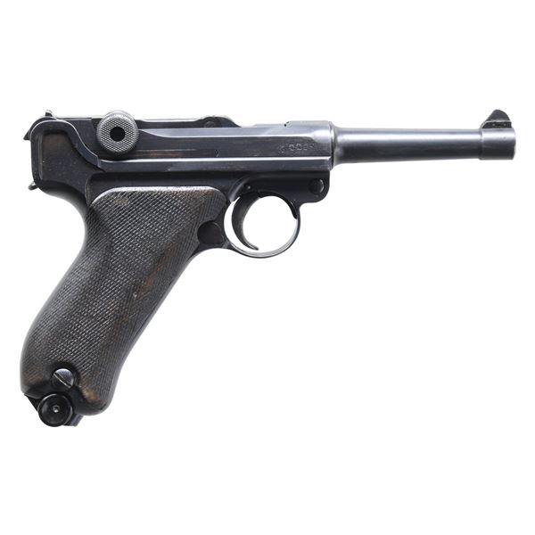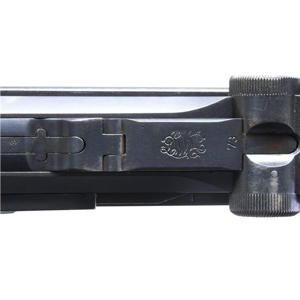 SEMI-AUTOMATIC PISTOL WITH HOLSTER. Cal. 9x19mm Parabellum. S# 2773a. Bbl. 4". P.08 Luger semi-automatic pistol mfg. by DWM in 1913 for the Imperial German military. The bbl. extension is marked "1913" over the chamber, with a "K" (not previously seen by this cataloger), followed by DWM arsenal proofs marked on the right. Left side of the bbl. and breechblock exhibiting a late 1920s / early 1930s period droop eagle proof. These eagle proofs, paired with the "K" stamp, likely indicate that this example was rebuilt sometime in the late 1920s to the early 1930s. Right side of the frame exhibits a small Imperial proof, indicating that this example was returned to the arsenal during the Imperial era to be retrofitted with a hold-open device. Metal components exhibit a reapplied blue finish overall. Frame is mounted with 2-piece non-matching period replacement grips. Serrated blade front sight with V-notch rear sight. Nearly all serialized parts are matching and include the frame, takedown lever, sideplate, trigger, safety lever & bar, bbl., bbl. extension, breechblock, extractor, firing pin, and toggles. Hold-open latch and trigger bar are mismatched, with the rear toggle pin being a later Mauser production replacement. Most numbers were likely reapplied at the time of rebuild/refurbishment. MAGS: 1 blued "fxo" 8-rd., with non-matching (S#: "5651") black synthetic plug. UNATTACHED ACCESSORIES: black leather holster marked with a mostly illegible mfg. above "1940" and mostly illegible acceptance proof marking. CONDITION: metal components retain the majority of their reapplied blue finish, showing some spots of mild edge wear fading to gray patina, scattered spots of light surface oxidation, as well as scattered spots/patches of light to mild pitting beneath the bluing overall. Bright bore, exhibiting light pitting, while retaining good to strong rifling throughout. Trigger must be held down for several seconds before firing pin is tripped. Grips are poorly fit, showing wear, smoothing, as well as scattered handling marks and impressions. Holster remains malleable, exhibiting general overall wear, scattered marks from handling ands storage, and some areas of age related cracking. Top of closure flap exhibits a small hole. An intriguing "1913" date DWM P.08 Luger. (25-5222/MLW). CURIO. $700-1,100.