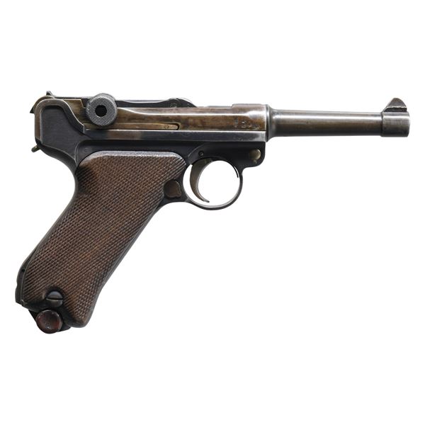 SEMI-AUTOMATIC PISTOL WITH HOSLTER. Cal. 9mm Luger. S# 8780h. Bbl. 4". P.08 Luger semi-automatic pistol mfg. at the Erfurt arsenal in 1917. Bbl. extension is marked "1917" over the chamber, with Erfurt arsenal proofs marked on the right (and repeated on various parts overall). Metal components exhibit an older reapplied blue finish overall, with some small parts exhibiting a reheated straw finish. Frame is mounted with 2-piece checkered wood grips, which appear to have been lightly sanded. Dovetailed blade front sight with fixed V-notch rear sight. All serialized parts are matching (including the grips), save for on the firing pin, which is unnumbered. MAGS: 1 8-rd. with unmarked wood plug. UNATTACHED ACCESSORIES: WWII production black leather P.38 holster mfg. by Carl Heinichen, marked "joa/ 1943" above an Eagle/WaA706 proof on the rear. CONDITION: metal components retain fair amounts of their reapplied blue finish, exhibiting wear and thinning that shows through to brown patina. Front and rear straps of frame exhibit consistent light pitting, with an area of moderate pitting present on the rear and left side of the frame. Bore exhibits consistent light to mild pitting, while retaining good rifling throughout. Grips show smoothing and some scattered marks and impressions, but otherwise remain sturdy and serviceable. Holster remains malleable, exhibiting general overall wear, with some light age related cracking and crazing. PROVENANCE: Estate Collection of Nicholas Apergis. (25-3967/MLW). CURIO. $500-700.