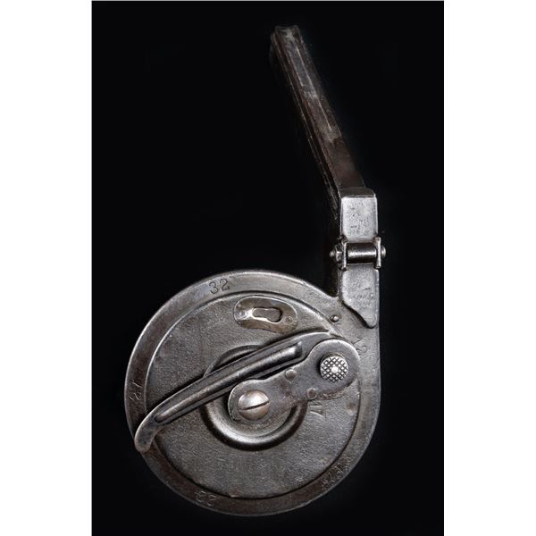 Second Model Luger snail drum mfg. during World War II. Front of the drum body and rear plate are stamped with the S# "608417" and a "B/ -/ N" proof, with "12", "17", "22", "27", and "32" stamped around the circumference of the rear plate. Mag. and drum bodies exhibit a blue finish, with the rear plate and winding mechanism exhibiting a black painted finish. CONDITION: good, with metal components retaining the majority of their arsenal finishes, exhibiting some areas of light to mild wear, some pitting, as well as some patches of light to mild surface oxidation. Winding mechanism is sound and retains strong spring tension. (02-25517/MLW). NON-GUN. $700-1,000.