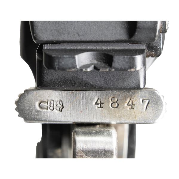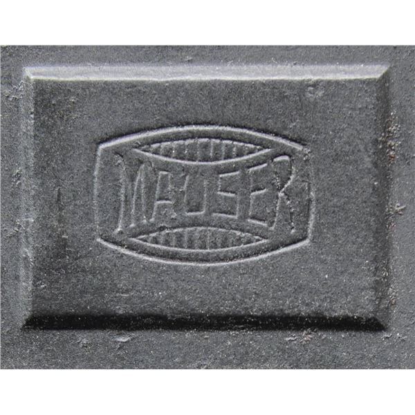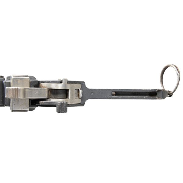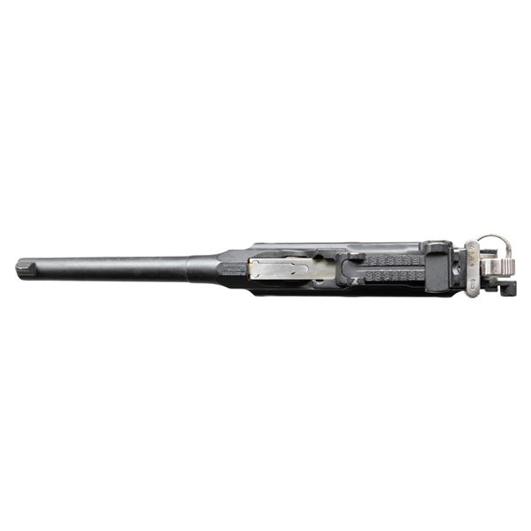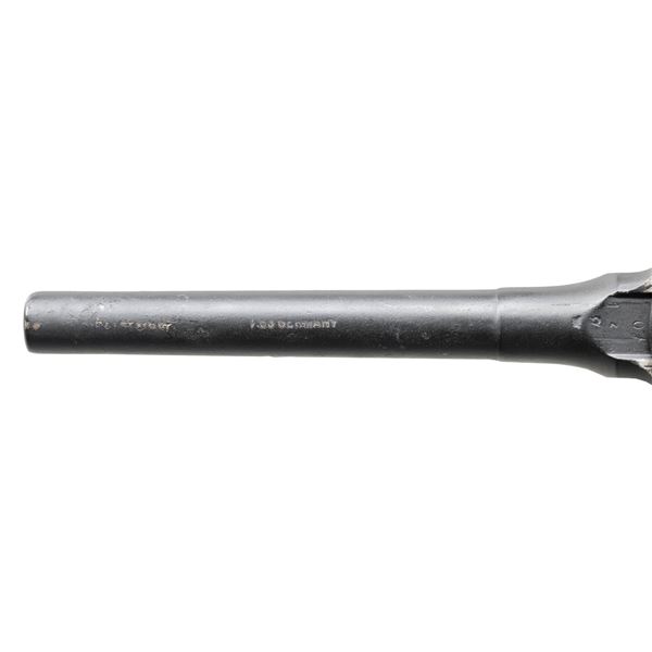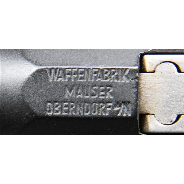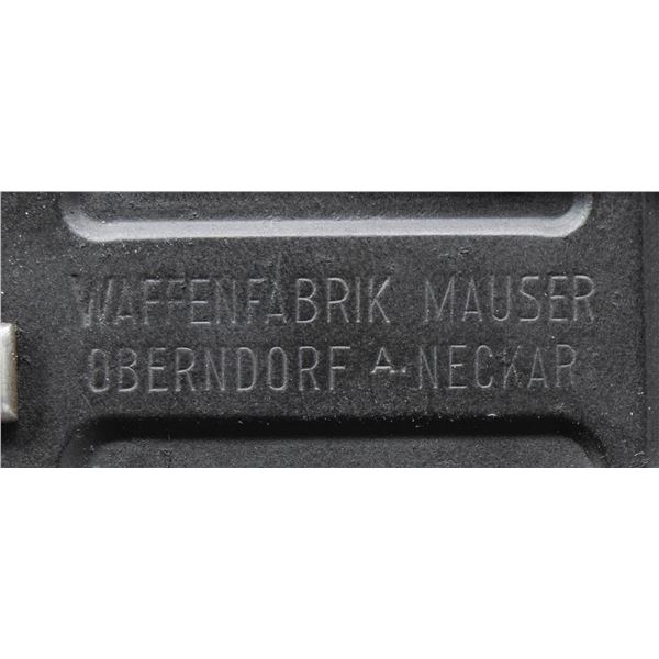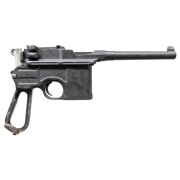 PISTOL. Cal. 7.63mm. S# 800073. Bbl. 5 1/4". C96 Model 1930 Commercial semi-automatic pistol mfg. by Mauser. Top flat of the faceted breech is marked with Mauser's 3-line address, with a double crowned "U" commercial proof marked on the left quarter flat, and the S# on the left flat. Underside of bbl. is Century Arms import marked. Left side of frame is marked with the Mauser banner logo on the milled island, with "WAFFENFABRIK MAUSER/ OBERNDORF A. NECKAR" marked on the right. Metal components exhibit a dull black enamel type finish overall, with the bolt and hammer having been polished in-the-white. Grips are absent. Standard fixed blade front sight with tangent V-notch rear sight graduated 50-1000. Matching numbers are present on the bbl./bbl. extension, frame (interior), sub-frame body, and floorplate. Bolt, follower, sear, and bolt stop housing are mismatched. Locking block is unnumbered. CONDITION: metal components retain the majority of their reapplied dull black enamel finish, showing scattered spots of wear and minor flaking, as well as scattered spots of bubbling and pitting beneath the finish overall. Bore exhibits consistent mild to moderate pitting, while retaining worn rifling throughout. Poor manual mechanics due to poor fitting of non-matching parts. (25-2694/MLW). CURIO. $200-300.