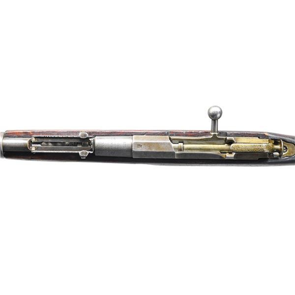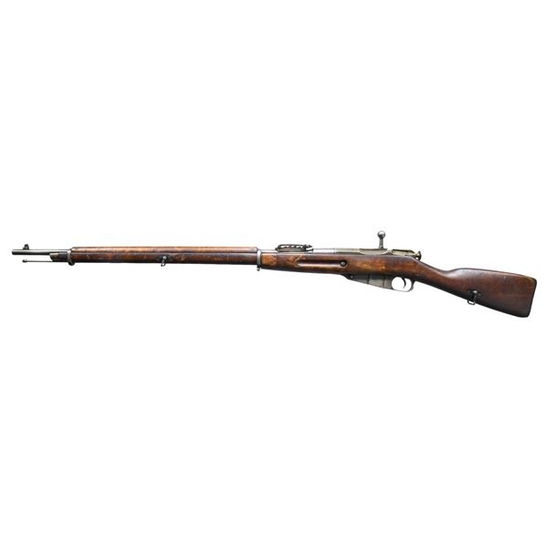 Cal. 7.62x54R. S# N70272. Bbl. 31 1/2" with Century import marking. Blade front sight. Konovalov rear sight with Finnish renumbered graduations. Matching numbers on bolt knob & bbl. shank. Other parts unnumbered or mismatched. Bbl. shank has Tula Peter the Great markings with intact Czarist eagle & 1915 date. Finnish two piece stock set with bottom mounted wire hangers & strong cartouche on right side of butt. Cleaning rod present. CONDITION: stock set shows a light chip behind upper tang, scattered finish loss, dings, scratches & handling marks. Metal is mostly a gray color with scattered light pitting, handling marks, oxidation & scratches. Action functions properly when hand cycled. Bore shows scattered pitting, a counterbore at muzzle & oxidation but evident rifling. (25-2837/MJC). CURIO. $300-500.