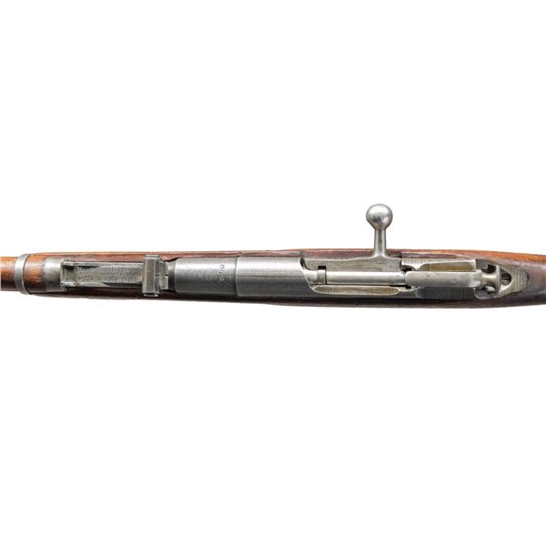 Cal. 7.62x54R. S# VT1078. Bbl. 29" with Century import marking. Post front sight with hood. Tangent rear sight graduated to 2000m. Floorplate has been arsenal renumbered to match, other parts are mismatched. Bbl. shank has Izhevsk & arsenal refurbishment markings with 1942 date. Left side of receiver has importer added serial number with translated prefix. Hardwood stock with screw-in sling slots. No cleaning rod present. CONDITION: stock set has large armorer splice repairs on front of forend, scattered dings, staining & handling marks. Upper tang is proud of wood. Balance of metal is a silvery-gray color with traces of arsenal rework blue, some pitting on mag body, handling marks & dings. Action functions properly when hand cycled. Bore shows scattered frosting & light pitting but strong rifling. (25-3800/MJC). CURIO. $100-200.