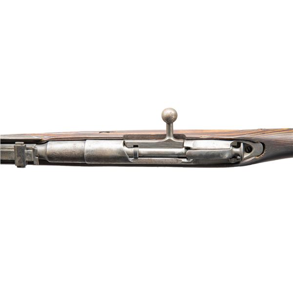 Cal. 7.62x54R. S# ZN1600. Bbl. 20 1/2" with Century import marking. Tangent rear sight graduated to 1000m. Matching numbers on bbl. shank & buttplate, other parts are mismatched. with bolt being of Hungarian mfr. Bbl. shank has 1944 date, Izhevsk & arsenal refurbishment markings. Left side of receiver has importer added serial number. Folding spike bayonet present. Laminated stock set with crossbolt on wrist. Cleaning rod present that does not stay locked in. CONDITION: stock has worn finish with toe splice, a few handguard cracks, scattered chipping, dings & handling marks. Metal is an overall silver-gray color with oxidation & handling wear. Action functions properly when hand cycled. Worn bore with scattered frosting & pitting. (25-3769/MJC). CURIO. $150-250.
