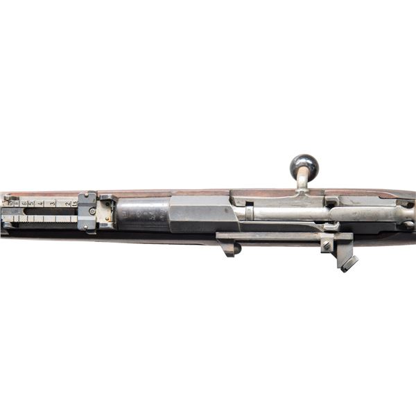 Cal. 7.62x54R. S# 45434. Bbl. 27" with Century import marking. Standard M39 sights. Rifle has been altered with modern PU scope base on left side of action & turned down bolt with large black knob. Due to knob we are unable to determine bolt number & other parts are mismatched. Bbl. shank has VKT, "SA" & "D" markings with 1942 date. Left side of receiver has importer added serial number. Blued finish. Hardwood wartime stock with round joints, bottom & left side sling swivels. Slip-on black cheekpiece with five cartridge loops. CONDITION: stock set appears lightly sanded with a long repaired crack across left side of butt, a few gouges, scattered dings, staining & handling marks. Metal retains 50% arsenal rework blue with scattered edge wear, some pitting, scratches, fading & oxidation. Action functions properly when hand cycled. Good bore with some light frosting but strong rifling. (25-3874/MJC). CURIO. $300-500.
