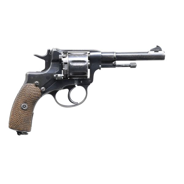 ACTION REVOLVER. Cal. 7.62x38mmR Nagant. S# B472. Bbl. 4 1/2". Model 1895 Nagant double action revolver mfg. at the Tula arsenal in 1939. Left side of the frame is marked with an arrow within a star above "1939", with small Russian arsenal proofs present overall. No visible import markings. Metal components exhibit a blue finish overall. Frame is mounted with 2-piece checkered wood grips, with checkered wood panels on the front and rear grip straps. Dovetailed blade front sight with U-notch rear sight on frame. All serialized parts are matching and include the frame, sideplate, and bbl. CONDITION: metal components retain the majority of their arsenal blue finish, showing light to mild edge wear, areas of wear and thinning (primarily on the bbl., ejector rod, and cyl.), as well as scattered spots of light to mild surface oxidation overall. Near mirror bore, exhibiting some scattered small spots of dark pitting, while retaining well defined rifling throughout. Proper manual mechanics in SA and DA. Grips show some smoothing, but otherwise remain sturdy and serviceable. (25-3732/MLW). CURIO. $200-400.