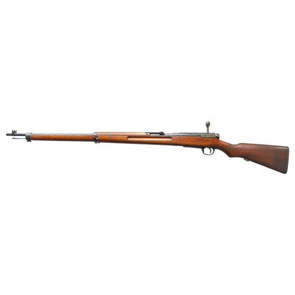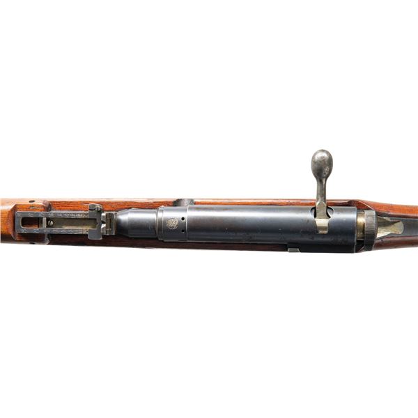 Cal. 6.5 Jap. S# 80497. Bbl. 31 1/2". Blade front sight with protective ears. Ladder rear sight graduated to 2400m. Mismatched numbers throughout. Receiver top has mum with several slash markings & Type 38 markings. Left side of receiver has 24th series & Kokura markings. Dust cover present that appears reblued. One of the tang screws is missing. Blued finish with strawed small parts. Asian hardwood stock with two piece butt & bottom mounted sling swivels. Cleaning rod present. CONDITION: stock set shows a few gouges, scattered dings, staining, scratches & handling marks. Dust cover shows scattered patches of blued over pitting. Balance of metal retains 80% original blue with some fading edge wear & light oxidation. Safety not functioning but action is otherwise functional when hand cycled. Bright near excellent bore. (25-3104/MJC). CURIO. $300-500.