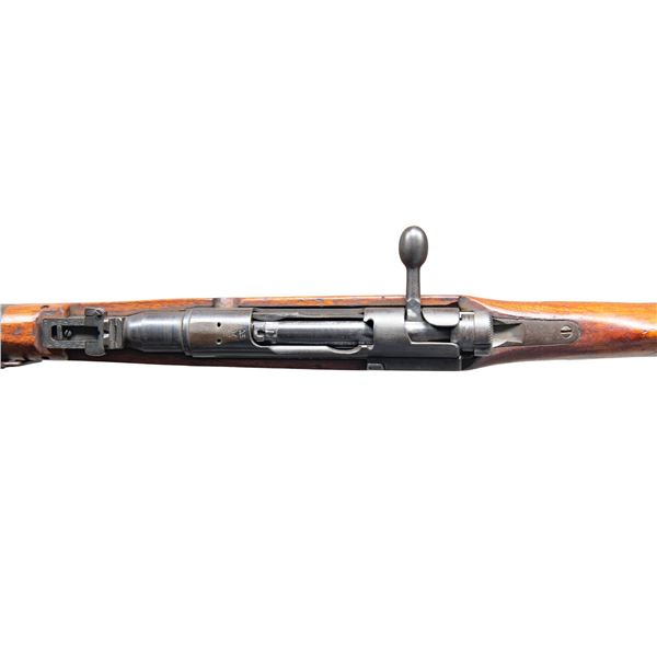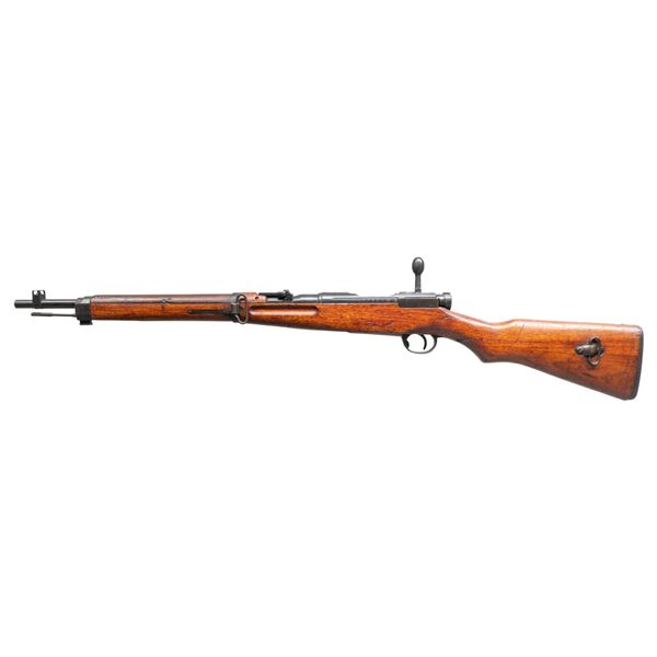 Cal. 6.5 Jap. S# 87317. Bbl. 19". Blade front sight with protective ears. Ladder rear sight graduated to 2000m. Matching numbers on receiver, bolt handle, bayonet lug, floorplate, firing pin & safety. Receiver top has ground mum & Type 38 markings. Left side of receiver has Nagoya & fourth series markings with serial number. Blued finish. Asian hardwood stock set with two piece butt & left side sling swivels. Handguard has a notably darker appearance than stock. Cleaning rod present. CONDITION: both sides of stock joint are separating at wrist, stock otherwise shows a set of initials on right side of butt, a thin crack ahead of bottom metal, scattered scratches, dings & handling marks. Metal is turning gray with strong traces of original blue & scattered oxidation. Action functions properly when hand cycled. Very good plus bright bore. (25-3837/MJC). CURIO. $300-500.