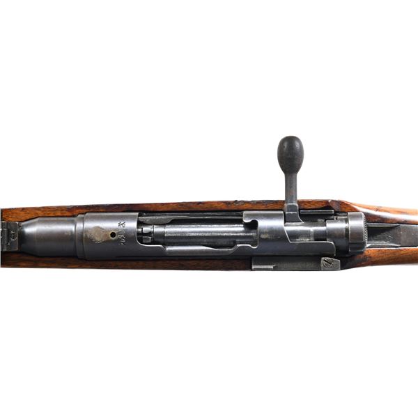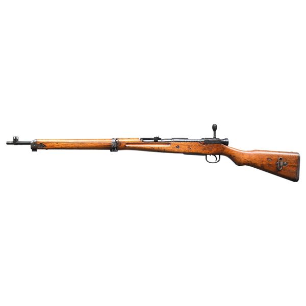 Cal. 7.7 Jap. S# 82754. Bbl. 25 1/2". Blade front sight with protective ears. Ladder rear sight graduated to 1500m without AA wings & missing top screw. Firing pin & safety are mismatched but other parts are matching to receiver. Receiver top has heavily ground mum with a dent & Type 99 markings. Left side of receiver has Nagoya & first series markings with serial number. Blued finish. Asian hardwood stock set with two piece butt, left side sling swivels & strong Nagoya inspection stamps. No cleaning rod present. CONDITION: stock set retains a high degree of Urushi with a few gouges, scattered dings & handling marks. Metal retains 40% original blue with overall fading to gray, edge wear & oxidation. Action functions properly when hand cycled. Bright near excellent bore. (25-2680/MJC). CURIO. $300-400.
