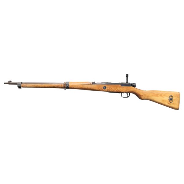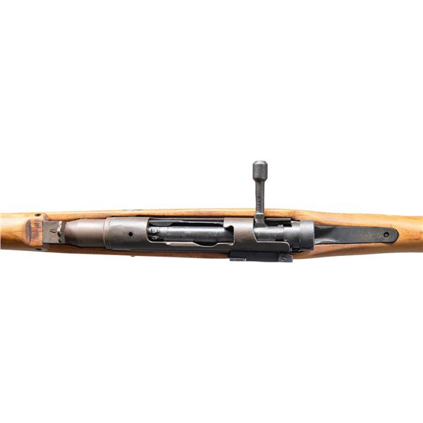 Cal. 7.7 Jap. S# 36509. Bbl. 25 7/8". Blade front sight. Fixed aperture rear sight. Bayonet lug unnumbered & late war bolt parts are mismatched. Receiver top has ground mum. Left side of receiver has Nagoya & 11th series symbols. Metal has a matte gray appearance Asian hardwood stock with two piece butt, separate forend & left side sling swivels. CONDITION: refinished stock set shows a repaired crack at rear of handguard, a few gouges & some handling marks. Metal has a matte gray appearance with some light pitting, possible touch up areas, some light oxidation handling marks & edge wear. Action functions properly when hand cycled. Good bright bore with some light frosting. (25-3813/MJC). CURIO. $150-225.