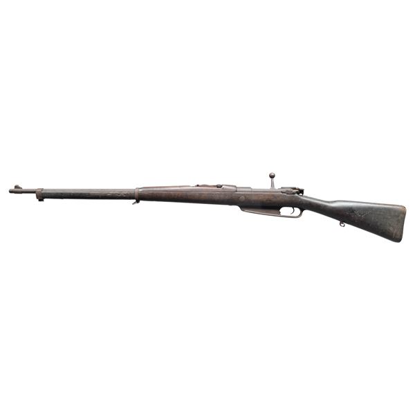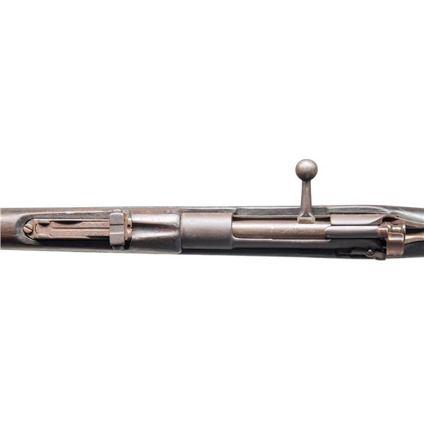 Cal. 8mm Mauser. S# 3I1148. Bbl. 29 1/4". Blade front sight. Tangent rear sight graduated to 2000m. Parts are unnumbered or mismatched. Receiver ring has no discernable markings. Asian hardwood stock with bottom mounted sling swivels. Right side of butt has varied Chinese roundels likely for schools or militias. No cleaning rod present. CONDITION: stock set has a darkened appearance with scattered cracks, chipping ,dings handling marks & scratches. Metal is a dull gray oxidized patina with scattered pitting. Safety not functioning & bolt has notable play but appears functional. Dark oxidized poor bore. (25-4397/MJC). CURIO. $150-250.