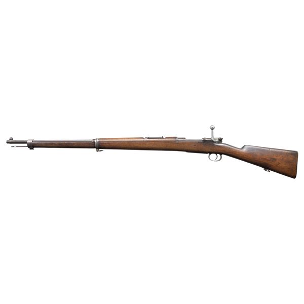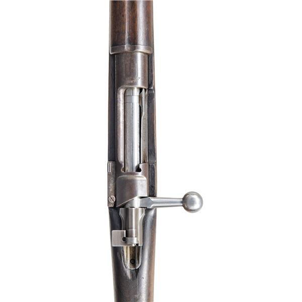 Cal. 7x57 (7mm Mauser). S# B2155. Bbl. 29". Blade front sight. Ladder rear sight graduated to 2000m. Bolt handle body appears unnumbered possibly scrubbed or replaced. Cleaning rod unnumbered & stock number is very faint but appears to match. Other visible parts are matching including back half of bolt. Spanish American War configuration Loewe made 1893 Mauser. It is probable this is one of the rifles sold by Bannerman or Springfield Armory after the conflict. Receiver ring has Spanish crest with "BERLIN 1894". Left side of receiver has standard Spanish 1893 & Loewe markings. Blued finish. Walnut stock set with bottom mounted sling swivels & faint 1894 dated cartouche on left side of butt. Cleaning rod present. CONDITION: stock set shows a small crack behind upper tang, scattered dings, handling marks & staining. Rear sight & bolt body have a bright cleaned appearance with oxidation & pitting. Bolt body is brighter than rear half of bolt assembly. Balance of metal is mostly gray with traces of bluing, oxidation, edge wear, pitting & some minor dings. Safety does not engage but action is otherwise functional when hand cycled. Bore shows scattered frosting & light pitting but good rifling. (01-28179/MJC). ANTIQUE. $300-450.