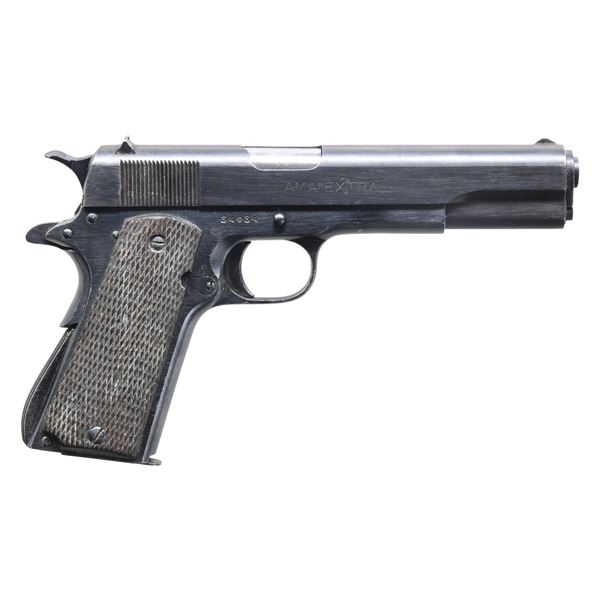 PISTOL. Cal. 9x23mm Largo. S# 34034. Bbl. 5 1/2". Llama Special semi-automatic pistol mfg. in Spain by Gabilondo Y Cia. Left side of the slide is marked with Gabilondo's mfg. information above the cal. designation and "LLAMA", with "LLAMA" in quotes followed by "EXTRA" marked on the right. Right side of the frame is marked with the S# above a small oval cartouche. Metal components exhibit a blue finish overall, save for on the chamber area of the bbl., which is polished in-the-white. Frame is mounted with 2-piece checkered wood grips and features a lanyard ring on the left side at the butt. All serialized parts are matching and include the frame, slide catch lever, slide, bbl. bushing, and bbl. MAGS: 1 8-rd. CONDITION: metal components retain the majority of their blue finish, showing light edge wear, scattered superficial handling marks, and some scattered spots of light surface oxidation. Relatively bright bore, exhibiting consistent light to mild pitting, while retaining strong rifling throughout. Proper manual mechanics. Grips show some wear and smoothing, but otherwise remain sound. (25-5060/MLW). CURIO. $300-500.