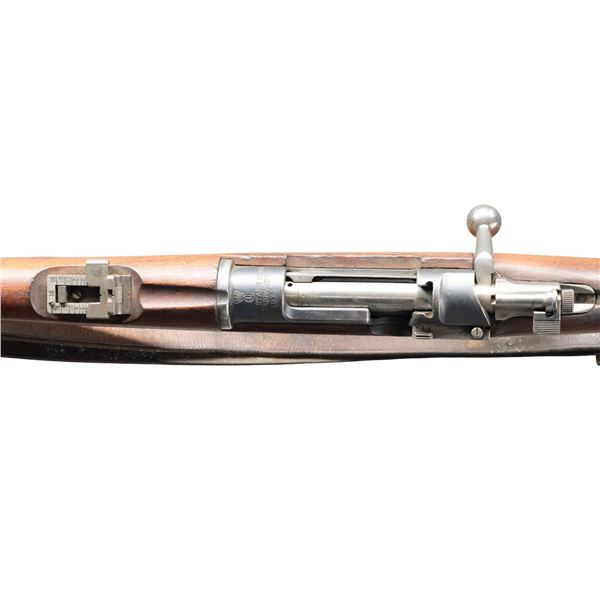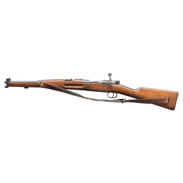 Cal. 6.5x55. S# 113129. Bbl. 18" with importer extension. Blade front sight with protective ears. Ladder rear sight graduated to 1600m. All visible matching numbers. Late production M94/14 Carbine made by Carl Gustafs in 1932. Blued finish. Beech stock set with left side sling provisions & leather sling. Right side of butt has data plate & stock disc with unit marking that reads "I.16/No. 927". CONDITION: stock set shows a chip forming near floorplate, scattered dings, scratches & handling marks. Metal retains 40% arsenal blue with overall thinning to gray, some handling marks, edge wear & some light oxidation. Safety requires cocking piece to be pulled further rearward to function. Action otherwise functions normally when hand cycled. Very good bright bore with strong rifling. (25-3836/MJC). CURIO. $400-600.