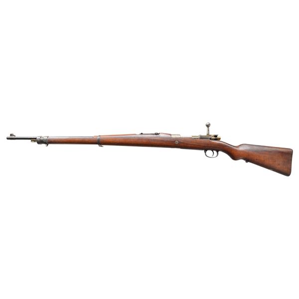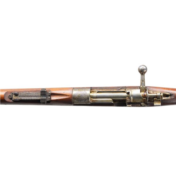 Cal. 7mm Mauser. S# 9757a. Bbl. 29" with import marking. Blade front sight. Tangent rear sight graduated to 2000m. All visible matching numbers. Receiver ring has Brazilian crest. Receiver, bolt, follower & buttplate are all in-the-white. Other parts are blued with some fire blued small parts. Walnut stock set with strong Star of David cartouche on right side, white paint rack number on underside of butt & bottom mounted sling provisions. No cleaning rod present. UNATTACHED ACCESSORIES: muzzle cover that is broken in two parts. CONDITION: stock set shows scattered staining, dings, impressions & handling wear. In-the-white parts show scattered cosmoline & some oxidation. Balance of metal parts retain 70% original blue with scattered thinning, fading, oxidation & cosmoline. Action functions properly when hand cycled. Bright near excellent bore. (25-2782/MJC). CURIO. $500-800.