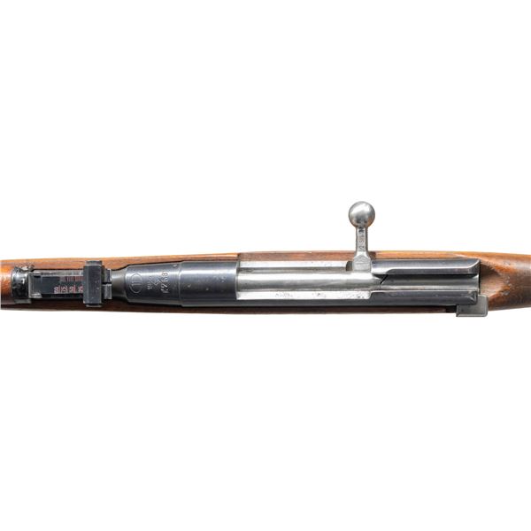 Cal. 22 LR. S# RK2587. Bbl. 24". Mosin style sights with rear graduated to 100m. Matching numbers on bbl. shank, bolt handle & buttplate. Polish made single shot Mosin Nagant style training rifle. Bbl. shank has 1956 date with Circle 11 Radom arsenal marking. Blued finish. Beech stock with bottom mounted sling slots. CONDITION: stock set shows scattered handling marks, wear, dings & scratches. Metal retains 60% arsenal blue with scattered fading to gray, oxidation, handling marks & edge wear. Action functions properly when hand cycled. Bright very good plus bore. (25-3909/MJC). CURIO. $300-400.