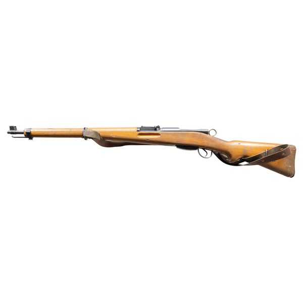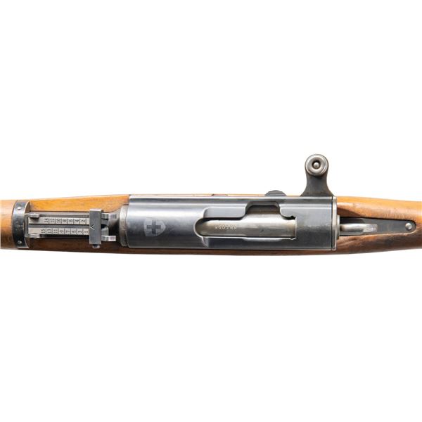 Cal. 7.5x55. S# 960186. Bbl. 25 5/8" with Century import marking. Blade front sight with protective ears. Tangent rear sight graduated to 1500m. All visible matching numbers including mag. Receiver top has Swiss cross marking. 1952 made K31 rifle. Arsenal blue finish. Beech stock set with Swiss cross cartouche on right side of butt, left side sling provisions & leather sling. MAGS: 1-6 rd. detachable matching to rifle. CONDITION: stock set shows some flaking most notable on toe, scattered dings, handling marks & scratches. Metal retains 50% arsenal blue with overall fading along receiver, scattered edge wear, light oxidation & handling marks. Action functions properly when hand cycled. Bright near excellent bore. (25-3791/MJC). CURIO. $300-500.