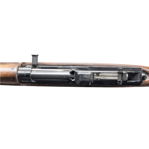 Cal. 30-06. S# 2608. Bbl. 23 1/5". Blade front sight with protective ears. Aperture rear sight graduated to 1000m. Matching numbers on receiver & Left side of rear sight base. Scarce Luxembourg contract FN-49 rifle with only 6306 units made for that country. Receiver top has "AL" Army of Luxembourg marking. Black enamel finish with a few markings having added white highlight. Walnut stock set with bottom mounted sling swivels & USGI style canvas sling. CONDITION: stock set shows some dings & handling marks. Metal retains 93% FN black enamel finish with scattered flaking & handling wear. Action functions properly when hand cycled. Bore shows some frosting & light pitting but strong rifling. (25-3826/MJC). CURIO. $500-800.