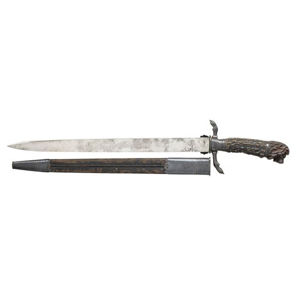 An exquisitely artistically produced Imperial German WWI era Hunting Association dagger or cutlass measuring 21 3/4" overall with a plain15 7/8" unmarked blade. Polished steel hilt with a down turned scallop shell guard and hooves at the quillons. Superb polished steel lion head pommel with a horn grip. Polished steel mounted leather scabbard with acorn frog stud. CONDITION: blade has some very minor discoloration. Hilt shows light wear and the steel has a wonderful dark patina. The scabbard mounts share the same patina and the leather body has 40% finish loss. (02-24916/BF). NON-GUN. $500-750.