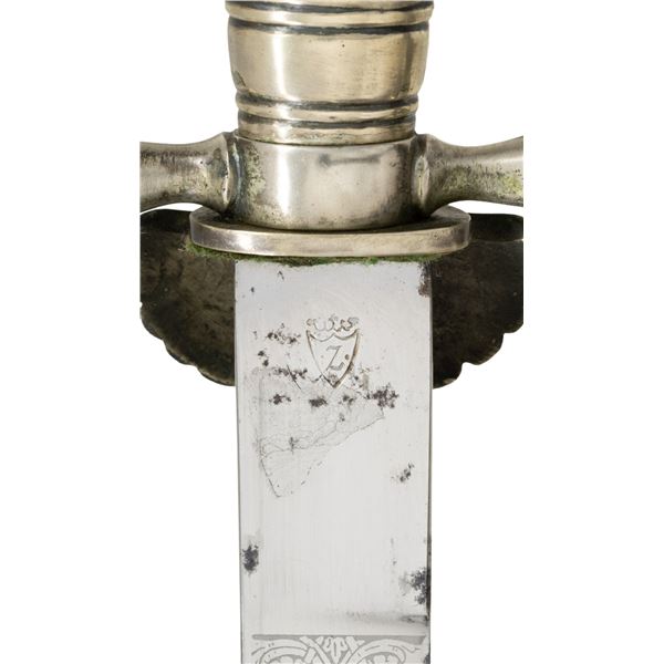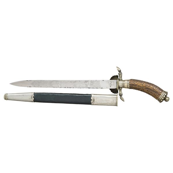 JUNG. This fine German WWII period Hunting Association dagger measures 19 1/4" overall with an etched 12 7/8" blade marked with a "Z" in shield for Clemen & Jung. The blade is etched with scroll motifs along with trees and game animals. Nickel silver hilt with a downturned scallop shell guard and hooves at the quillons. German silver pommel with a ball capstan. Horn grip with a central deer head insignia of the Hunting Association. German silver mounted leather scabbard with acorn frog stud. CONDITION: blade has some discoloration on the edges. Hilt shows light wear as does the scabbard. The tip of the scabbard is missing its staple. (02-24927/BF). NON-GUN. $700-1,200.