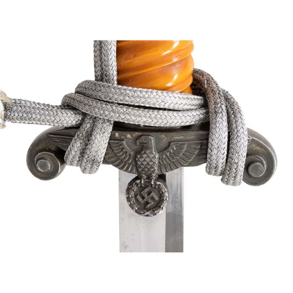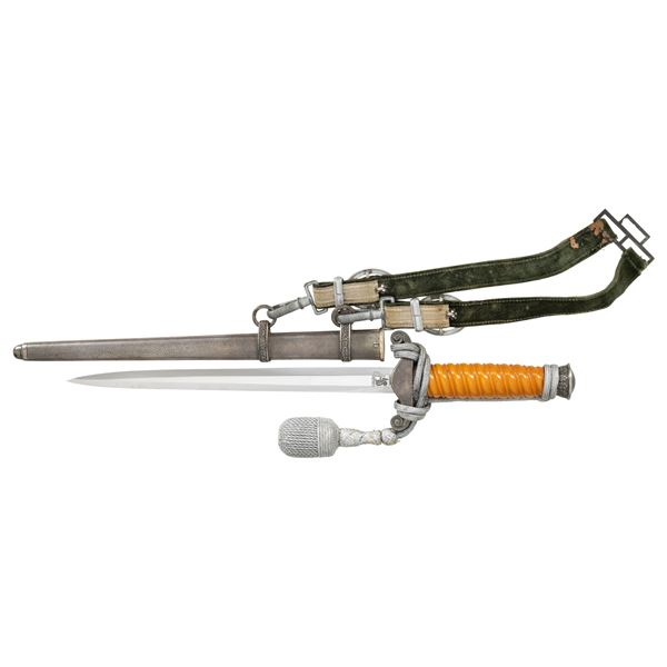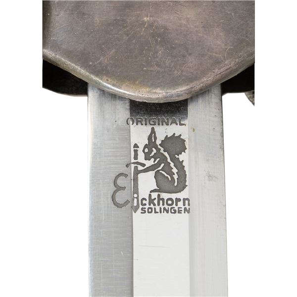 PORTEPEE & HANGER. Eickhorn produced more German army officer daggers during WWII than any other maker. This example was mfg between 1935-41 and carries the ORIGINAL / Squirrel / EICKHORN / SOLINGEN trademark that was utilized during this time frame on its polished blade. The fittings are silver plated with a type A crossguard and a 12 leaf pommel. Solid celluloid pumpkin grip. The silver plated scabbard has oak leaf bands with steel rings, stippled panels, and single screw fastened throat. It is accompanied with an aluminum bullion portepee and hanger with aluminum fasteners and buckles. CONDITION: overall fine. Blade is fine with some scabbard rubbing and crisp makers mark. Guard and pommel are fine with good silver plating exhibiting a balanced aged tarnish and scattered mild handling marks. Grips are fine with a couple of small dings and a minor chip. Portepee is good with some minor fraying. Scabbard is fine with nice plating showing a similar even aged tarnish. Hangers are fine with a little staining. (02-24965/ZAL). NON-GUN. $400-600.