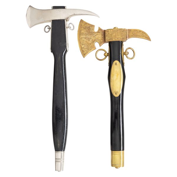1) A very fine WWI German fireman dress Ax with gold plated fittings on a black enameled haft. The ax measures about 14" in length and the head is 7" across with a 3 3/4" bit. The Head is etched with oak leaves as well as a fireman and scenes of fire equipment. There is a ring on either side of the haft an and oval plate that has not been inscribed. CONDITION: very light wear. 2) A fine WWI German fireman dress Ax with plated fittings on a black enameled haft. The ax measures about 15 1/2" in length and the head is 7" across with a 2 1/8" bit. There is a ring on either side of the haft an cap on the butt. CONDITION: very light wear. (02-24964/BF). NON-GUN. $700-1,200.