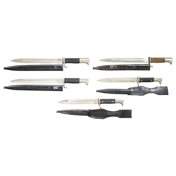 This group of 5 WWII German dress bayonets include 2 long pattern bayonets with black two piece grips, one of which has a blade that has been sharpened. / 1 Long pattern bayonet with simulated stag grips made from wood. / 2 short pattern bayonets with two piece black grips and original black frogs. CONDITION: all bayonets show light wear except as noted above. (02-24929-1/BF). $400-600.