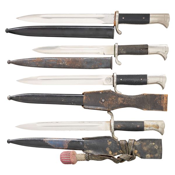 This lot contains 2 German Army long pattern dress bayonets with scabbards. One scabbard has a frog. / 1 German Army short pattern dress bayonet in a rough long pattern scabbard. / 1 German Fire Service dress bayonet with scabbard, frog, and knot attached. CONDITION: all bayonets show light wear unless noted above. (02-24160/BF). NON-GUN. $400-600.