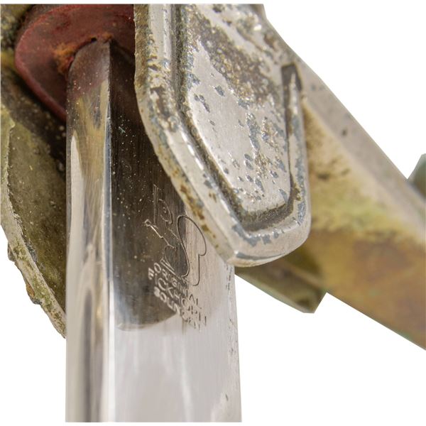 OFFICER'S SWORD BY EICKHORN. A fine WWII German Army officer's sword of the Eickhorn Field Marshal's series call a Prinz Eugen pattern measuring 38 1/2" overall with plain 32 3/4" single fullered blade. The blade is marked at the ricasso " (logo) ORIGINAL EICKHORN SOLINGEN". Silvered hilt with an eagle crossguard, embellished knuckle bow & backstrap and a Wehrmacht eagle on top of the pommel. Wire wrapped black composite grip and black enameled scabbard. CONDITION: blade shows original factory polish. Hilt and scabbard show light wear. (02-25010/BF). $500-800.