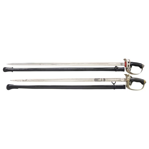 1) A fine Prussian M1889 folding guard Cavalry Officer's sword measuring 38 1/4" overall with a 31 3/4" blade. The single fullered blade is etched with foliate decoration and a blued panel that shows a mounted Cavalry Officer on one side and a blued panel that reads " Jager zu Pferde XI. A. k. "on the other. The plated hilt has a folding guard, with a pierced Prussian eagle, that is a bit loose. Shaped composite grip and a black enameled scabbard. CONDITION: blade is a bit dull and could use a cleaning. Hilt and scabbard show light wear. 2) A very fine Prussian M1889 folding guard Cavalry Officer's sword measuring 39 1/2" overall with a 33" blade. The single fullered blade is etched with foliate decoration and a panel that shows an opposed cavalry charge on one side and a blued panel that reads " Ulanen Regt. v. Schmidt (1. Pomm.) No.4 " with a crowned "URS 4" on the other. The plated hilt has a folding guard, with a pierced Prussian eagle, that is a bit loose. Shaped composite grip and a black enameled scabbard. CONDITION: blade shows substantial original factory finish, Hilt exhibits very light wear. Scabbard seems to be 1/4" short. (02-25014/BF). $400-600.