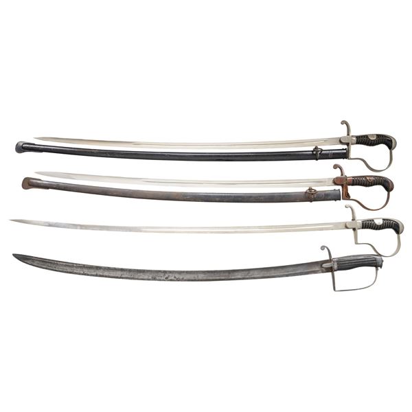 1) An officer's saber measuring 39 1/4" overall with a plain single fullered 32 3/4" blade marked "ALBERT LOSCHER HAMM". Plain plated hilt with a birds head pommel. Wire wrapped black composite grip with a black enameled scabbard. CONDITION: blade retains original polish and the hilt shows light wear. Scabbard has 80% finish. 2) An officer's saber measuring 38" overall with a plain single fullered 31 3/4" blade marked "A C (logo) S". Plain brass hilt with a birds head pommel. Wire wrapped black composite grip with a black enameled scabbard. CONDITION: blade retains original polish and the hilt shows light wear with a dark brown patina. Scabbard has 40% finish with dents. 3) An officer's saber measuring 40" overall with a plain single fullered 35" blade marked "F.W. HOLLER (logo) SOLINGEN". Plain plated hilt with a birds head pommel. Wire wrapped black composite grip. No scabbard. CONDITION: blade retains original polish with some spotting, and the hilt shows light wear. 4) An early 1800s saber measuring 37" overall with a 32" plain single fullered blade. Plain iron hilt with narrow langets and a reeded wood grip. No scabbard. CONDITION: blade has a dark patina with evidence of cleaned pitting. Hilt has a gray patina and the grip shows moderate wear. (02-24164/BF). NON-GUN. $400-700.