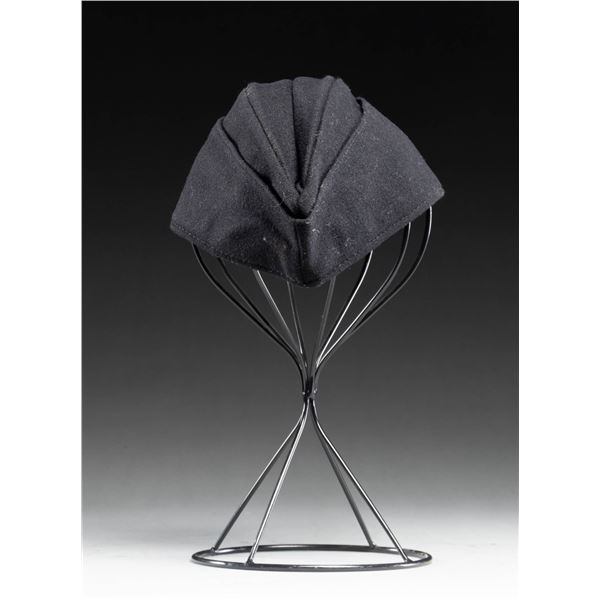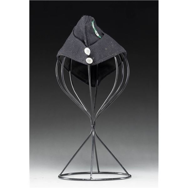 A fine WWII German NSKK or National Socialist Motor Corps overseas cap in black with a flat bullion NSKK eagle on green sewn to the left side. There are two small NSKK buttons on the front of the cap. The cap is lined in black cotton with a worn brown RZM style tag on the interior left. CONDITION: cap shows light overall wear. (02-24863/BF). NON-GUN. $250-400.