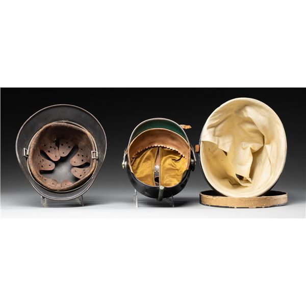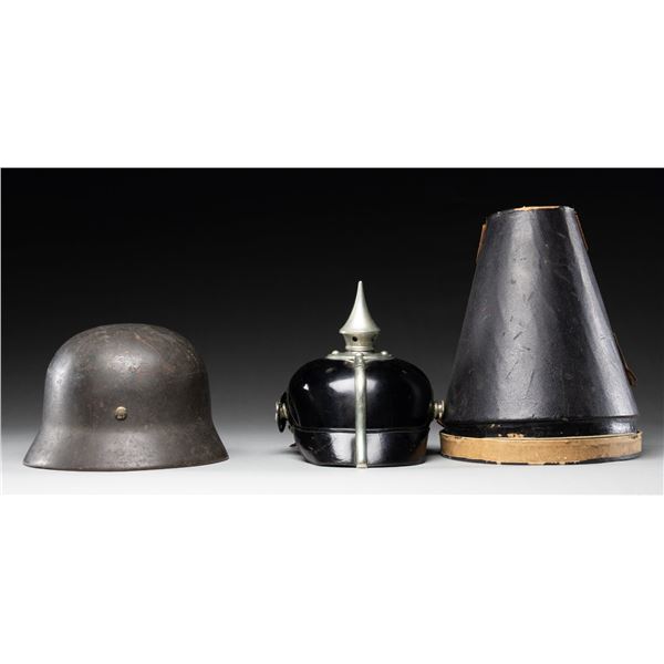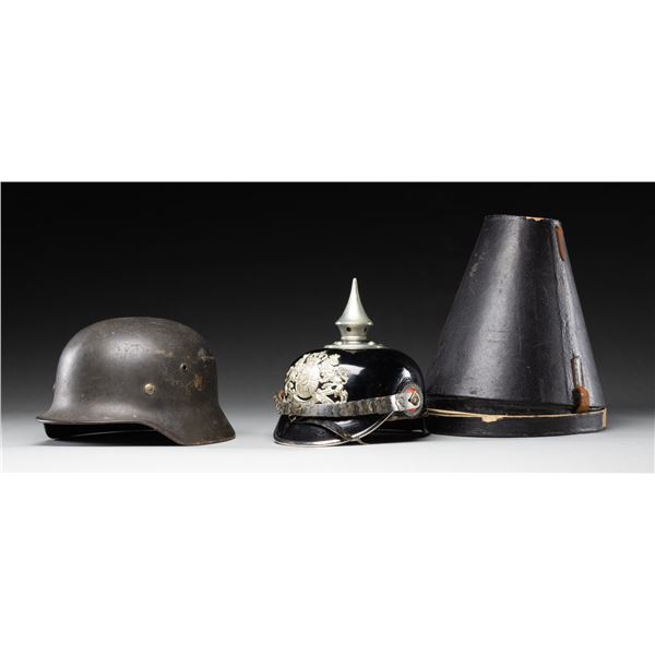 1) WWI Bavarian officer's grade spike helmet with all silvered trim possibly for a Pioneer regiment. The spike has a round base with 4 rivets and connects to a silvered backstrap. Silvered Bavarian front plate with silvered chin scales and visor trim. There is one national kokard present. The interior has a tan leather sweat band with a silk crown liner. Helmet comes with its original black helmet case. CONDITION: light wear overall. The case is missing all straps and the top cover of the case. 2) A nice WWII German M1935 battle helmet field gray with no evidence of ever having decals. The interior rear is stamped "3225" and the interior left is stamped "Q64". Full original liner but no chinstrap. CONDITION: helmet finish is about 85%. Liner is dry but solid. (02-24113/BF). NON-GUN. $800-1,200.