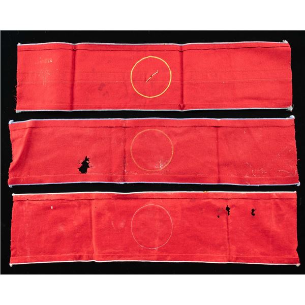 This group of 3 WWII German Political Leader armbands include 1 Kries level administrative armband. / 1 Orts level local leader candidate's armband. / 1 Orts level Group Leader's armband. CONDITION: the Orts Group Leader armband shows light wear and the others show some moth damage. (02-24909-3/BF). $500-800.