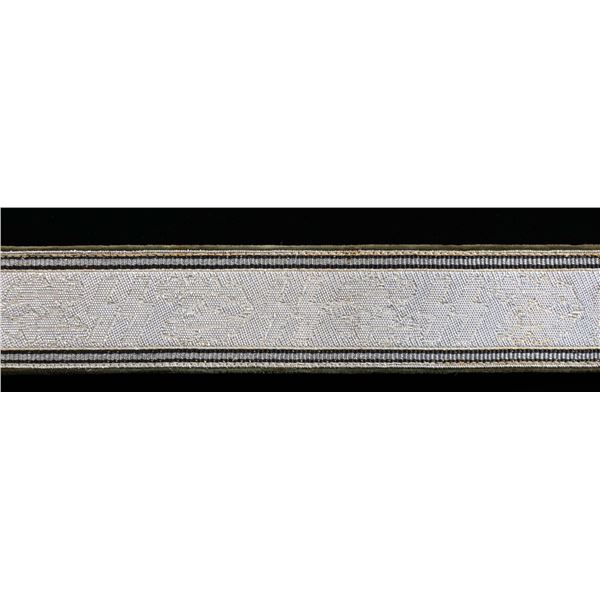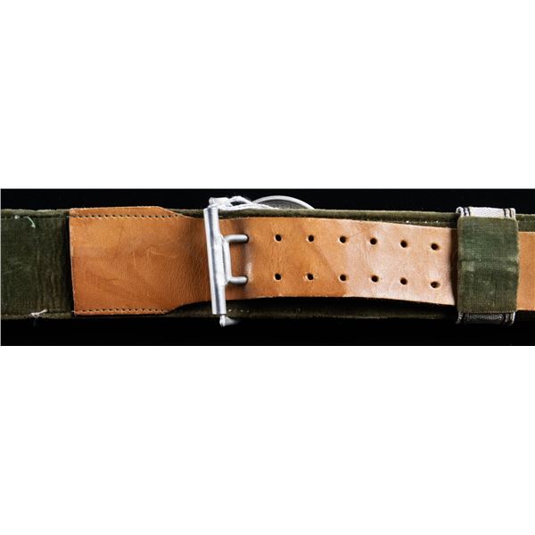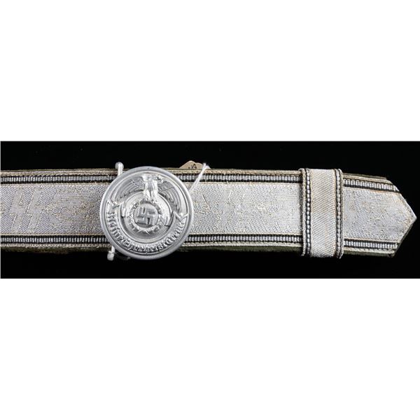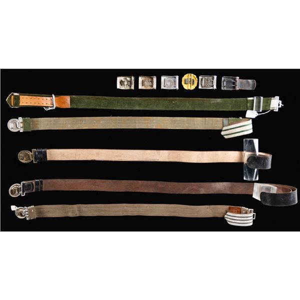 This fine group of 11 belts and buckles from WWII Germany include 1 SS enlisted man's buckle likely manufactured late in the war by Overhoff. / 1 Westfalen fire officials belt and 2 -piece buckle. / 1 RAD officer's brocade belt and 2-piece buckle. / 1 Army officer's brocade belt and 2-piece buckle. / 1 SS officer's brocade belt and 2-piece buckle by Overhoff. / 1 Penal or Justice Administration official's belt and 2-piece style buckle (no keeper). / 1 Gold tone Naval officers buckle with no keeper. / 1 Aluminum Red Cross enlisted man's buckle. / 1 German Youth enlisted style buckle. / 1 Aluminum HJ enlisted style buckle. / 1 Luftwaffe enlisted buckle. CONDITION: all belts and buckles are complete and show light wear except as noted above. (02-24866/BF). $1600-2200.