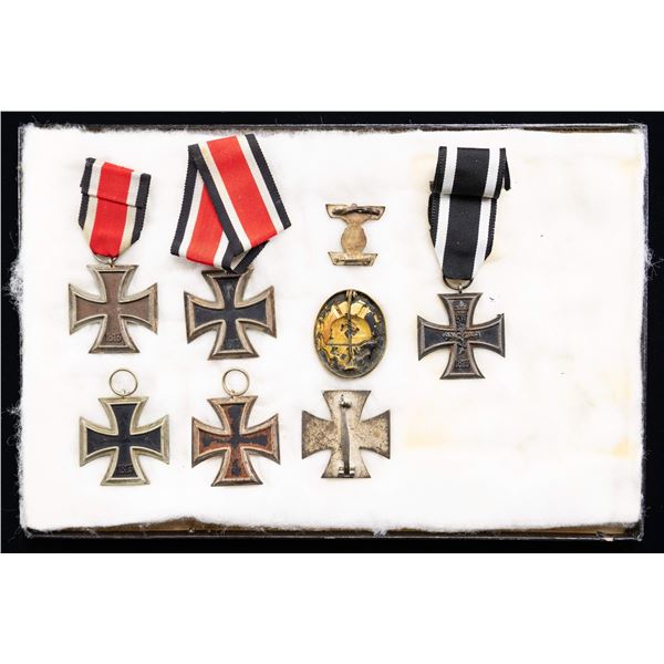 This WWI and WWII German lot consists of 2 WWII 2nd Class Iron Crosses with ribbons. / 2 WWII 2nd Class Iron Crosses without ribbons. / 1 WWII 1st Class Iron Cross with a wide pin. / 1 WWI 2nd Class Iron Cross with ribbon. There is a Spange attached to the ribbon with 4 angle cut flat wires on the reverse. / 1 Spange with 3 of 4 flat wires present. The tips of the wires are beveled. / 1 Black Wound Badge in brass with black finish remaining in the protected areas. CONDITION: all medals and awards show light wear unless otherwise noted. (02-24878-3/BF). $800-1200.