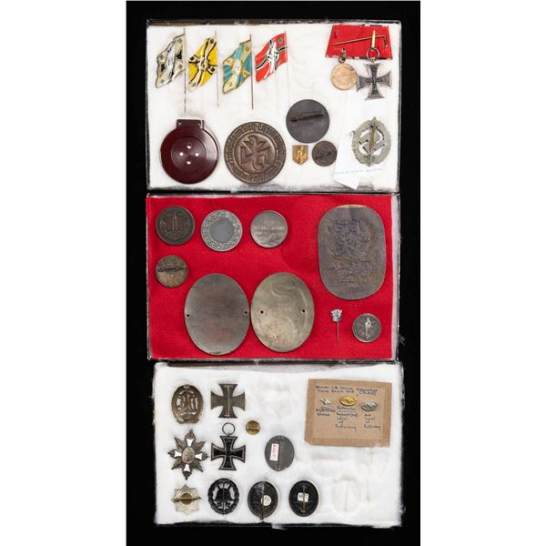 This lot a various WWII German items includes 1 NSV plaque medallion. / 1 Sports Badge for a wounded veteran. / 1 Medal bar of two WWI medals that include the Iron Cross 2nd Class and an Austrian bravery medal. / 1 Bakelite Party symbol possibly for a vehicle. / 1 Four metal flags carried by toy soldiers. / 3 Shooting award pins. / 1 Large DDAC enamel car tag. / 1 Large DDAC enamel car tag for a doctor. / 1 Hunting association sleeve patch with heavy oxidation. / 1 Hunting association silver medal for 1931. / 1 Hunting association tinnie for 1939. / 1 Hunting association stickpin. / 1 Hunting association green & white enamel pin from 1938. / 1 Pre WWII Hunting association pewter medal. / 1 bronze medal dated 1912 for hunting. / 3 DLRG membership pins of different levels. / 2 Black Wound Badges. 1 WWI Black Wound Badge. / 1 Silver Wound Badge with notable oxidation. / 1 DRL Sports Badge. / 1 WWI 1st Class Iron Cross. / 1 WWI 2nd Class Iron Cross. / 1 Imperial German field medal pinback star award. / 2 Prussian enamel pins. CONDITION: mist items show light wear unless otherwise noted. (02-24878-11/BF). $800-1200.