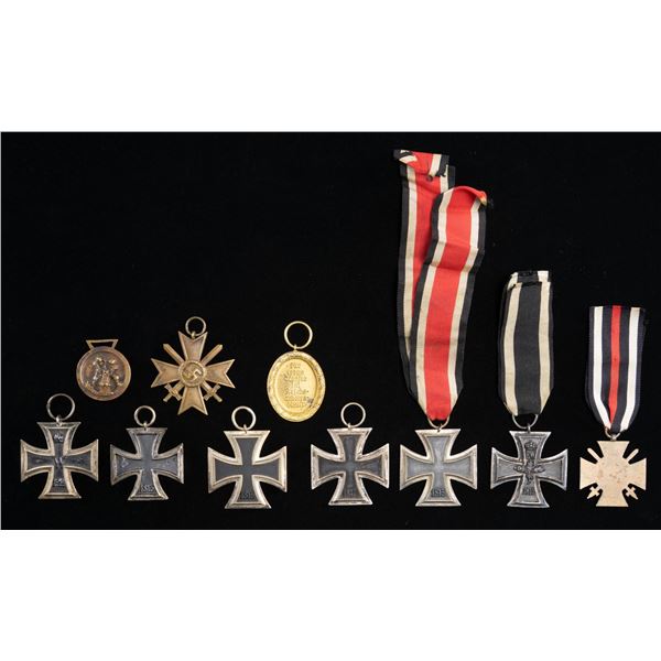 This lot of German medals includes 1 WWI 2nd class Iron Cross with ribbon, / 1 WWI 2nd class Iron Cross without ribbon. / 1 WWII 2nd class Iron Cross with ribbon. / 2 WWII 2nd class Iron Crosses without ribbons. 1 WWII 2nd class Iron Cross with a non-magnetic center and no ribbon. / 1 WWI War Service Cross with swords and ribbon. / 1 German-Italian Afrika Korps medal with no ribbon. / 1 RAD Long Service award with no ribbon. / 1 WWII War Merit Cross with sword but no ribbon. CONDITION: all medals show light wear and tarnish. (02-24078/BF). NON-GUN. $350-550.