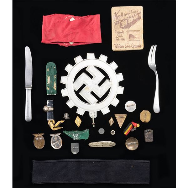 This fine lot consists of 1 Luftwaffe mess knife. / 1 Luftwaffe mess fork. / 1 DAF aluminum flag pole top measuring 8" in diameter. / 1 DAF pocket atlas. / 1 Party armband. / 1 Veteran's organization armband. / 1 Customs officer's shoulder board. / 1 HJ membership pin. / 1 Gold bordered HJ membership pin. / 1 Green cloth and silver bullion Customs eagle. / 1 Well worn Party symbol silver ring. / 1 Silver handled "DEUTSCHLAND ERWACHT" pocket knife of questionable age. / 1 Frauenorden enamel pin with damage. / 2 lapel ribbons. / 6 Tinnies of questionable age. / 1 1936 Mai Day tinnie. / 1 Zinc 5 pfennig coin. / 2 small German pins. CONDITION: all items show light wear unless otherwise noted. Much of this lot is original however, it contain items we feel may be reproduction. Please examine this lot carefully before bidding. (02-24081/BF). NON-GUN. $200-400.